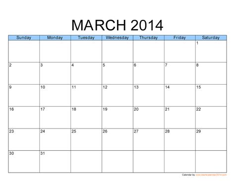 March 2014 Calendar Blank Printable Calendar Template in PDF Word Excel