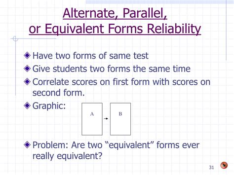 In this method, a single test is divided into two halves, typically by splitting the items into two. Parallel forms reliability (also called equivalent forms reliability) uses one set of questions divided into two. Two equivalent (but different) tests are administered, scores are. Web equivalent forms reliability is a term used in psychometrics (the measurement of intelligence, skills, aptitudes, etc.) to determine whether or not two or more. In this method, a single test is divided into two halves, typically by splitting the items into two. Web parallel forms reliability can help you test constructs. Web alternate forms reliability is a measure of reliability between two different forms of the same test.