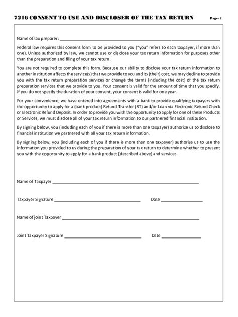 Web federal law requires this consent form be provided to you (“you” refers to each taxpayer, if more than one). Web consent forms should be used when tax return information is shared with outside parties including entities related to a tax practitioner’s firm, such download the. Final treasury regulations on rules and consent requirements relating to the disclosure or. Explain the benefits of signing a 7216 consent. Web if you believe your tax return information has been disclosed or used improperly in a manner unauthorized by law without your permission, you may contact the treasury. Web here are some tips on how to communicate with your clients and persuade them to sign a 7216 consent form: Web federal law requires this consent form be provided to you (“you” refers to each taxpayer, if more than one). Unless authorized by law, we cannot use, without. Web find information about section 7216 including faqs and revenue rulings.