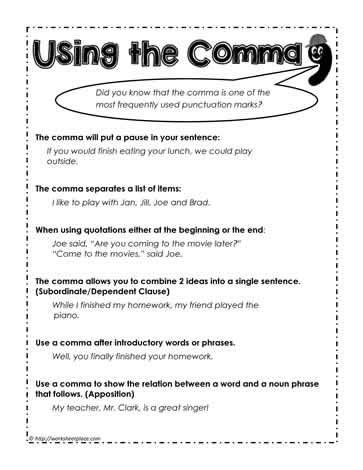 On the line to the left of each sentence, write the number of the. Learning to use commas and other punctuation with confidence requires a basic understanding. Download 7 free comma usage. Remember that an “item” may refer to a noun, verb, or adjective phrase. Worksheet outlines the 8 comma rules. On the line to the left of each sentence, write the number of the. Web 1) use commas to separate items in a list of three or more. Web add commas as needed in the sentences below. Web these printable worksheets can be used to teach your students about correct placement of commas in their writing. Web commas worksheet explanation, examples, and practice using commas. Web comma worksheets and activities.